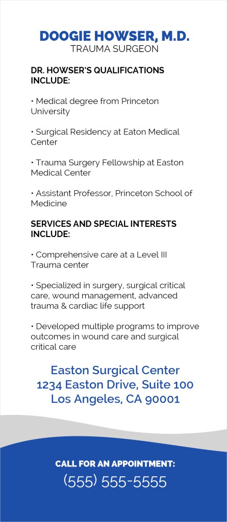 Two-sided Physician Panel Cards are available with custom name, phone number, address, website, affiliated hospitals, qualifications, and additional information of your choice. Our standard Panel Card design template can be seen below. If you need something more custom, just ask!